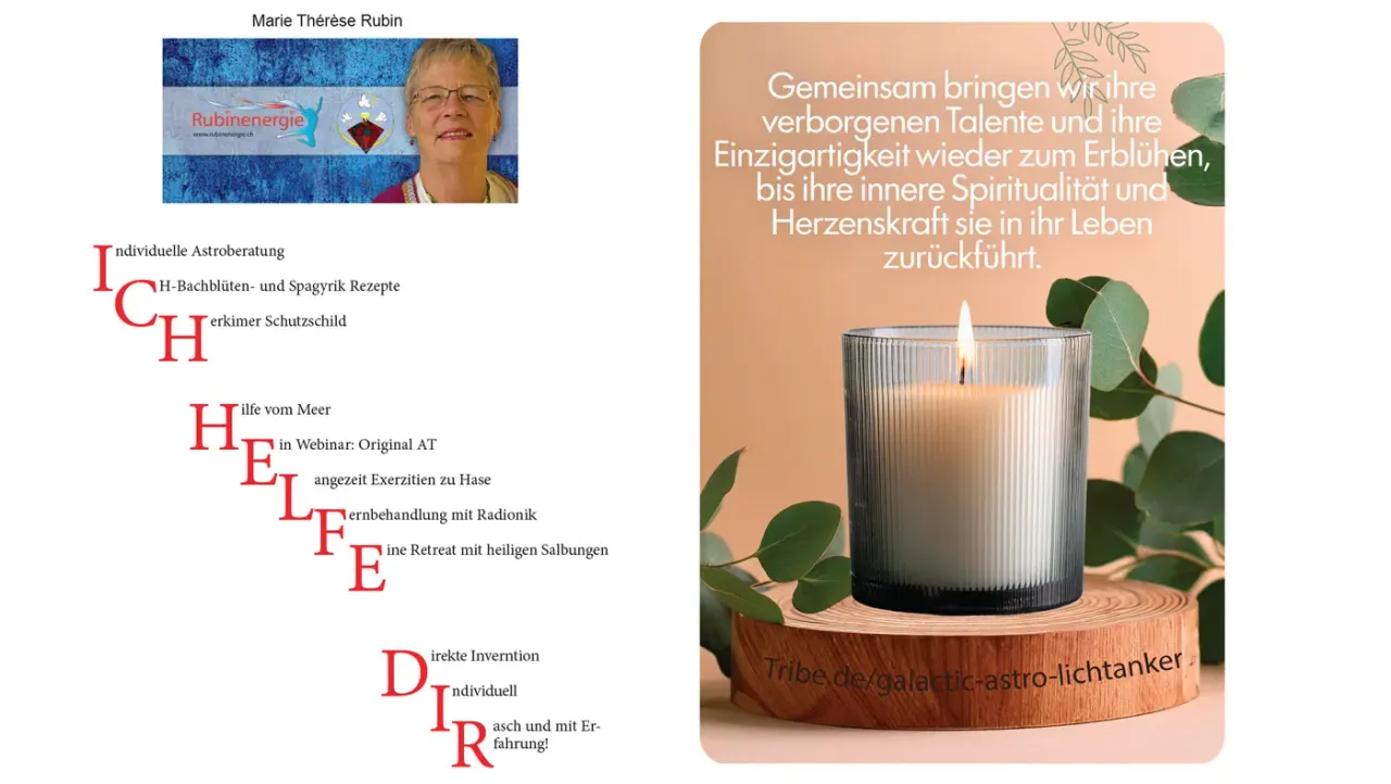 Persönliche Astro-Frequenz-Rezepte mit Bachblüten, Spagyrik, Steine usw. unterstützen dein Wohlbefinden, deine Gesundheit – helfen bei Lebens-, Seelenproblemen und der spirituellen Entwicklung. Körperliche, emotionale, seelische Störungen können durch Astro-Frequenzträger transformiert werden. Frequenzrezepte benötigen Adresse und Geburtsdaten. Lerne dein astrologisch errechnetes Seelenziel kennen, lass dir bei deiner spirituellen Entwicklung helfen. Persönliche Analyse per Videobotschaft oder in schriftlicher Form. GalacticAstro zeigt dir wo sich dein Seelenziel im Horoskop befindet und wie du die ICH-BIN erlernen kannst.