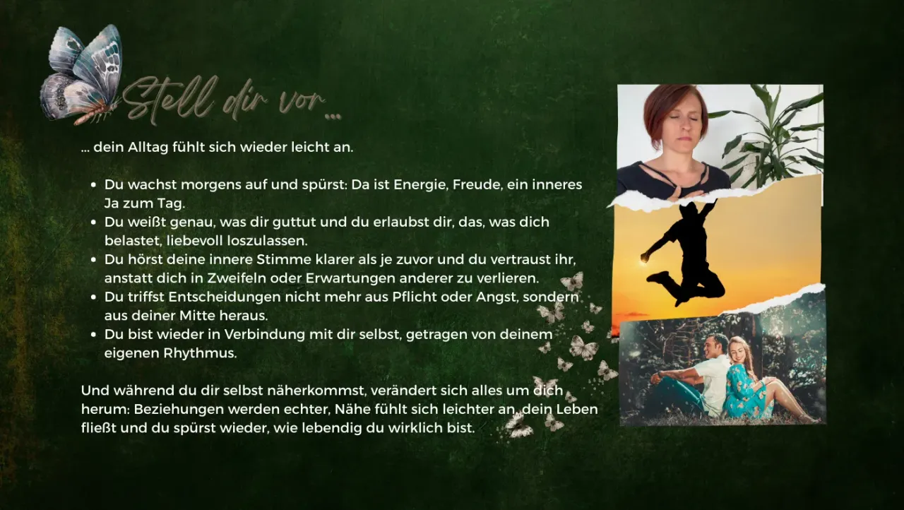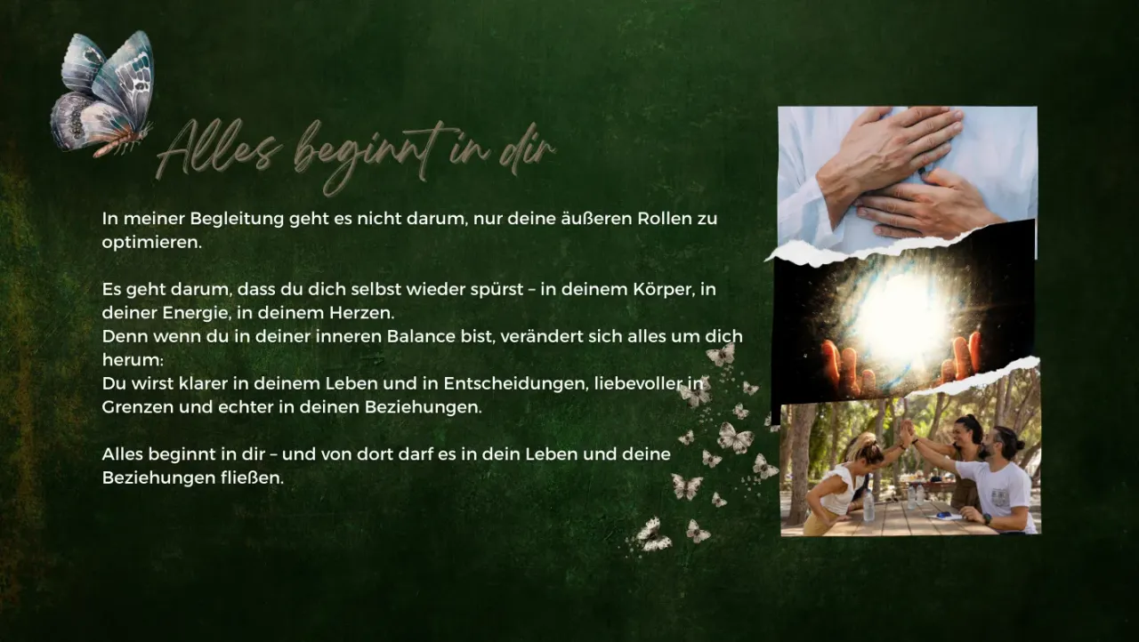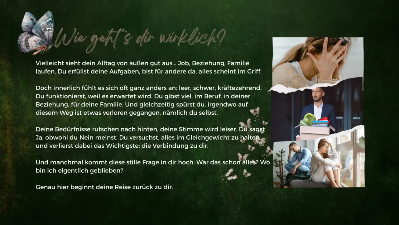 So begleite ich dich sanft, klar und kraftvoll zurück zu deiner Mitte, damit du wieder spürst, wer du wirklich bist und wie lebendig du dich fühlen kannst.