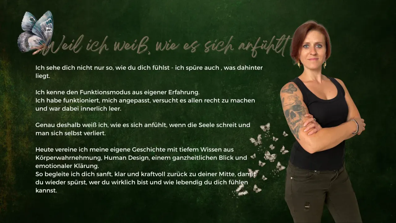 Heute vereine ich meine eigene Geschichte mit tiefem Wissen aus Körperwahrnehmung, Human Design, einem ganzheitlichen Blick und emotionaler Klärung.