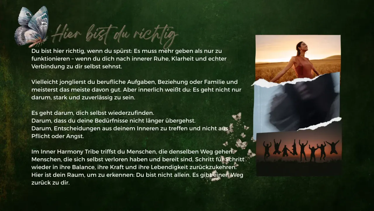 Tritt dem Inner Harmony Tribe bei und erlebe, wie es sich anfühlt, wieder ganz du selbst zu sein.